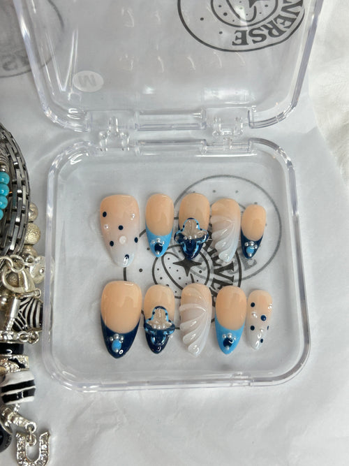 Icy Blue French Press-On Nails | Nude Base with Blue Accent | Handmade Reusable Nail Set